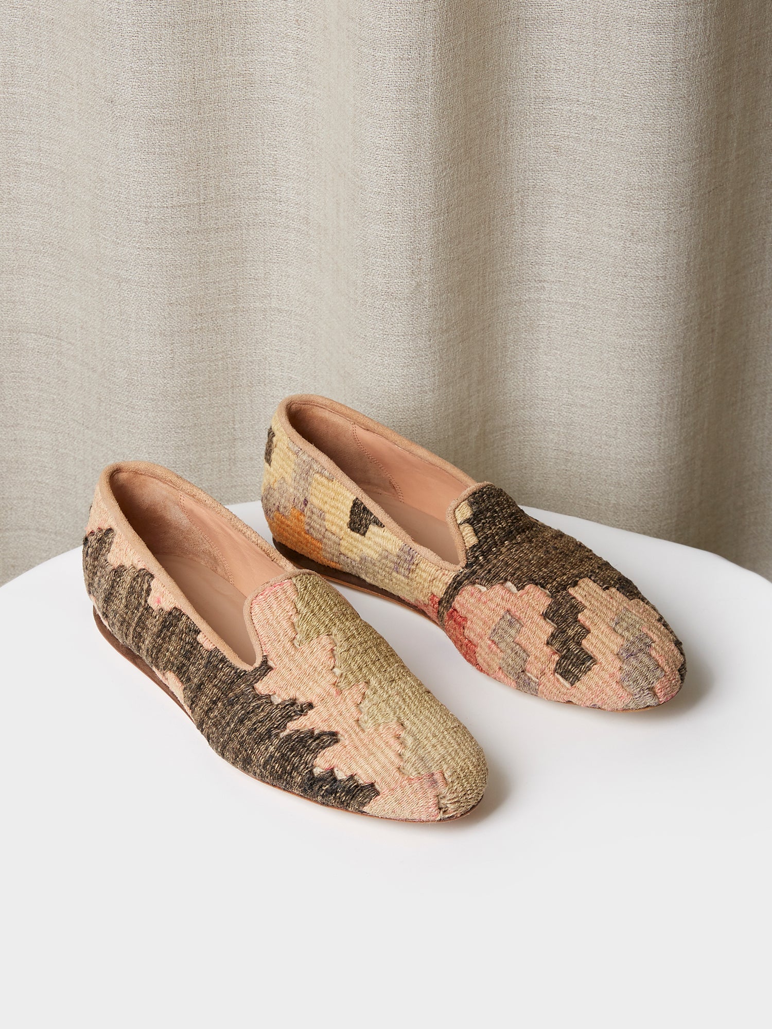 Handcrafted from traditional textiles of the former Persian Empire, our Kilim loafers are a colorful tapestry of culture and endurance. Woven by skilled artisans, each pair narrates folk stories through vibrant patterns, offering a unique, regenerative touch.