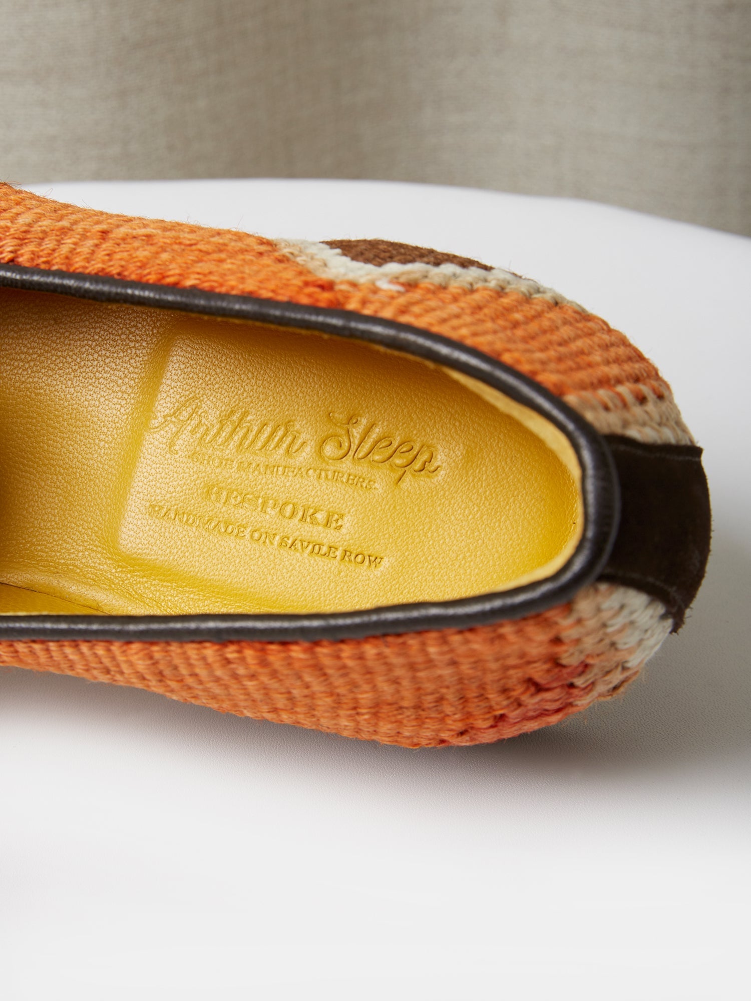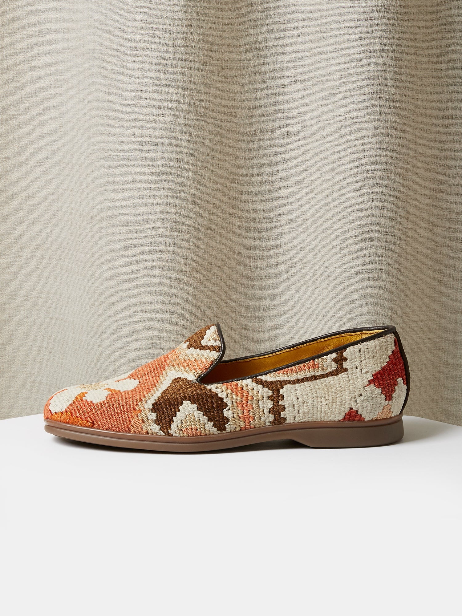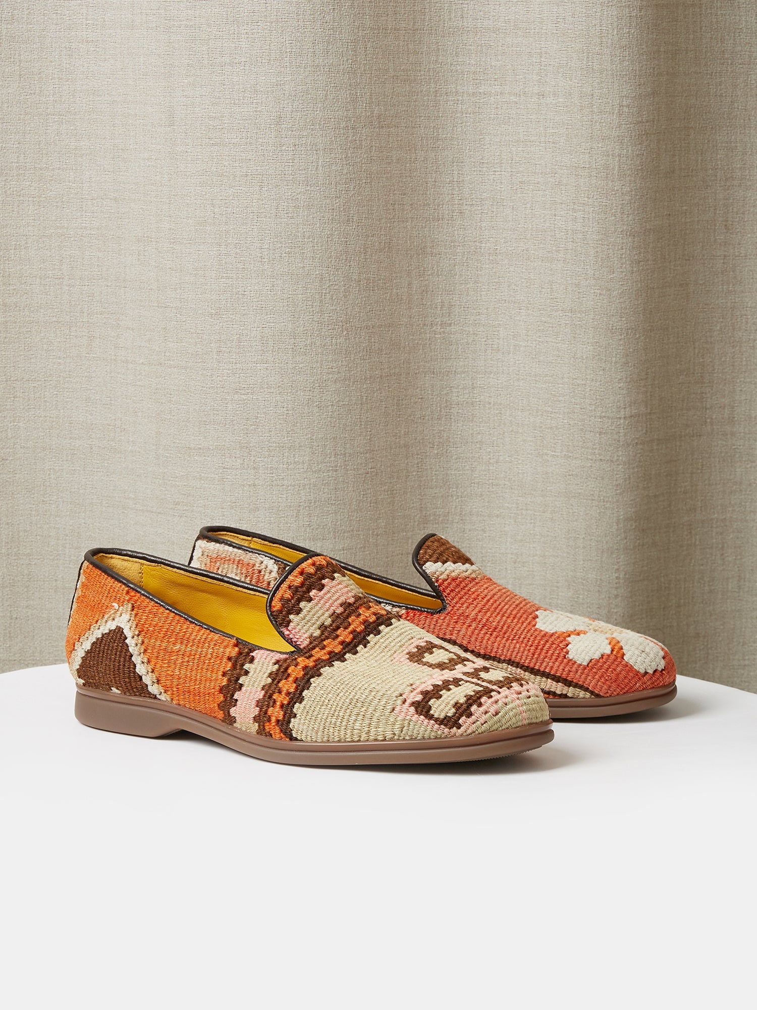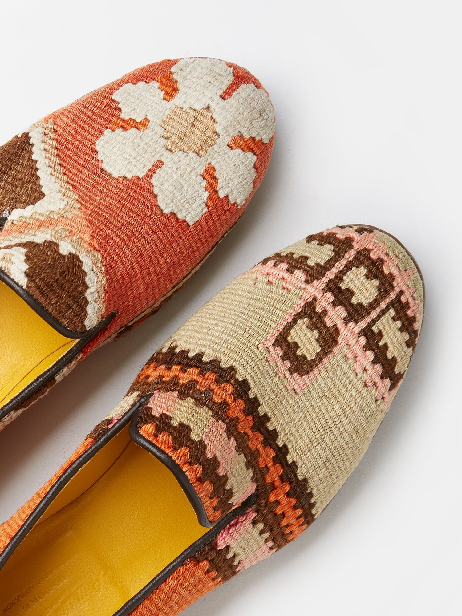 Handcrafted from traditional textiles of the former Persian Empire, our Kilim loafers are a colourful tapestry of culture and endurance. Woven by skilled artisans, each pair narrates folk stories through vibrant patterns, offering a unique, regenerative touch.