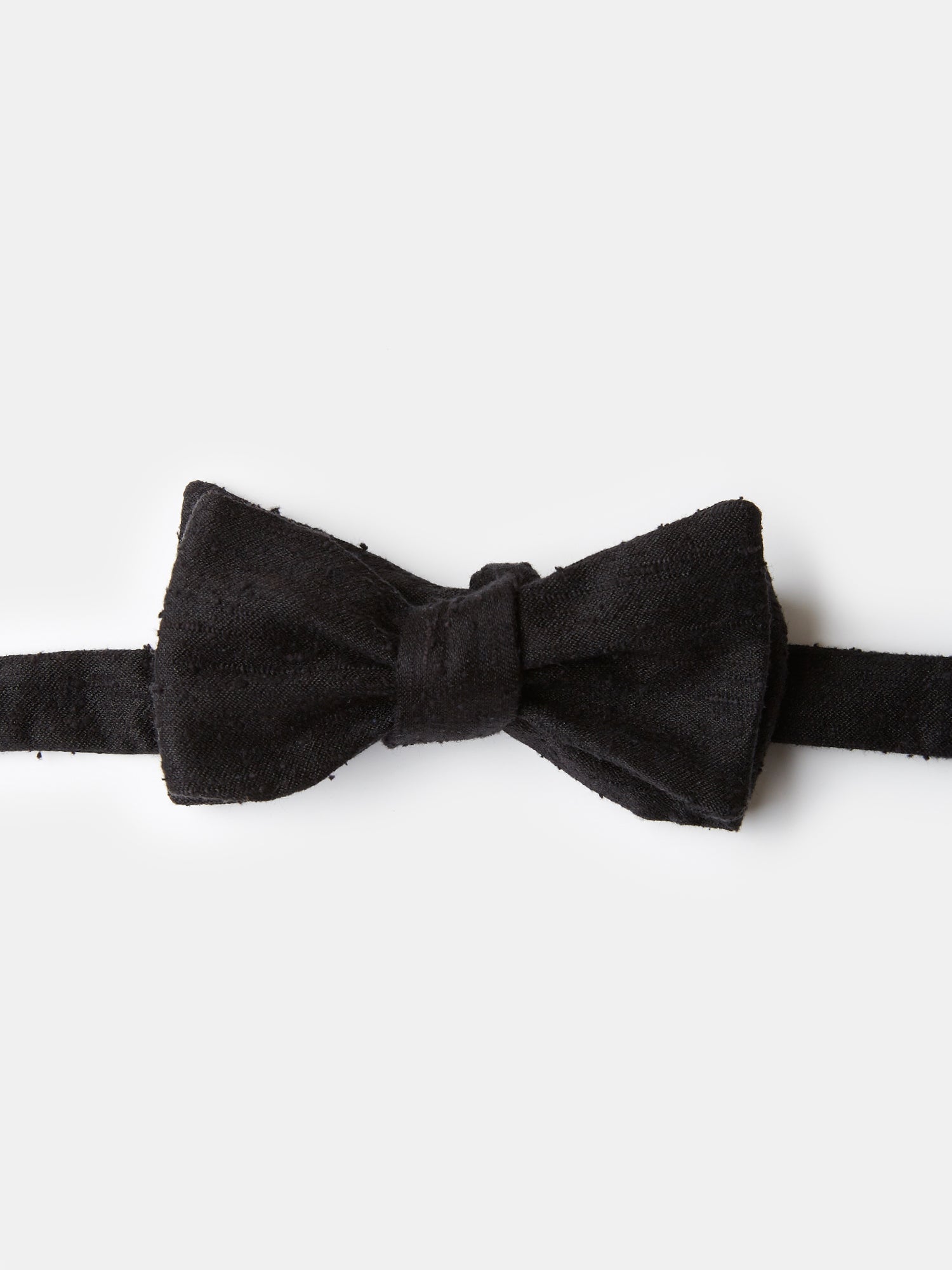 A superb bow tie in raw black shantung silk, the perfect finishing touch for any black tie event. The subtle irregular texture of shantung lends a unique character to this beautifully cut and shaped tie.