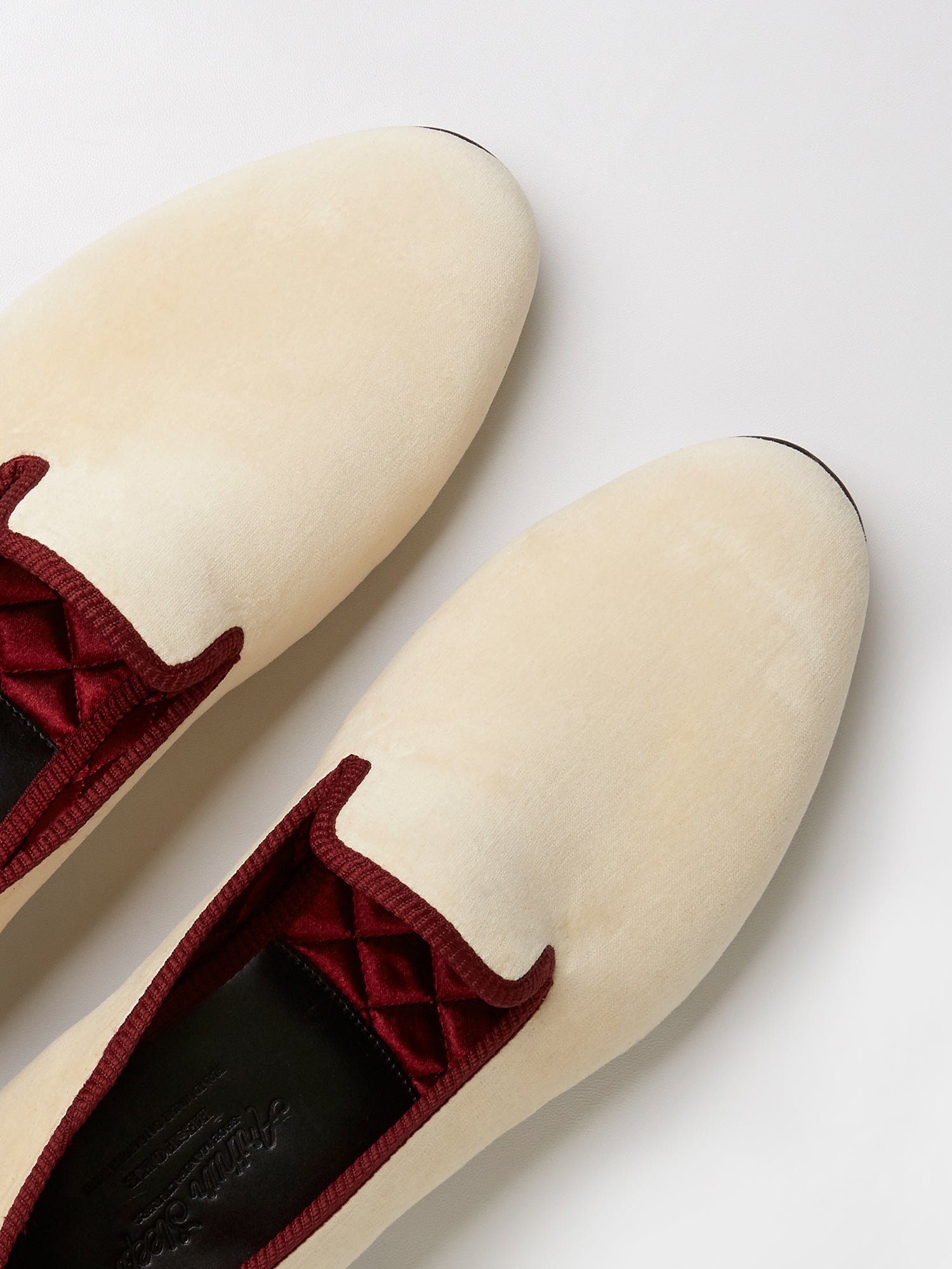 The world’s most sophisticated house shoe can also be worn outdoors, thanks to their hard-wearing leather soles and advanced stain and water protection. As natural a fit with a dressing gown and loungewear as with your cream tuxedo, these velvet slippers exude relaxed sophistication.
