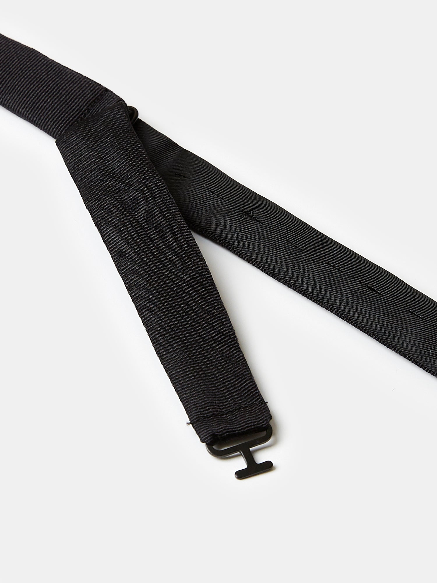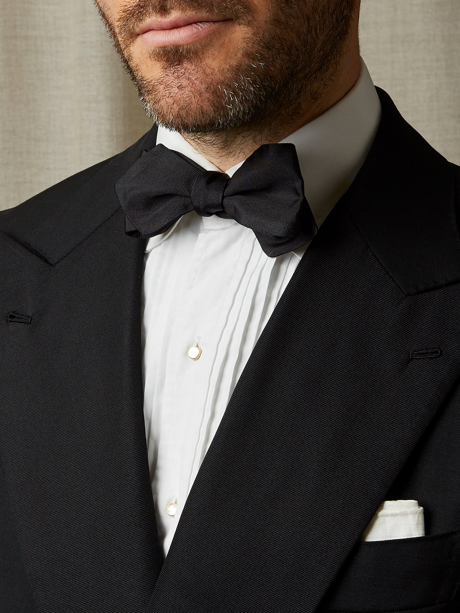 A pointed bow tie in black grosgrain silk, the perfect finishing touch for any black tie event. With pointed ends, this bow creates a subtle but charming touch of asymmetry. This tie is a perfect match for dinner jackets with grosgrain lapel facings.