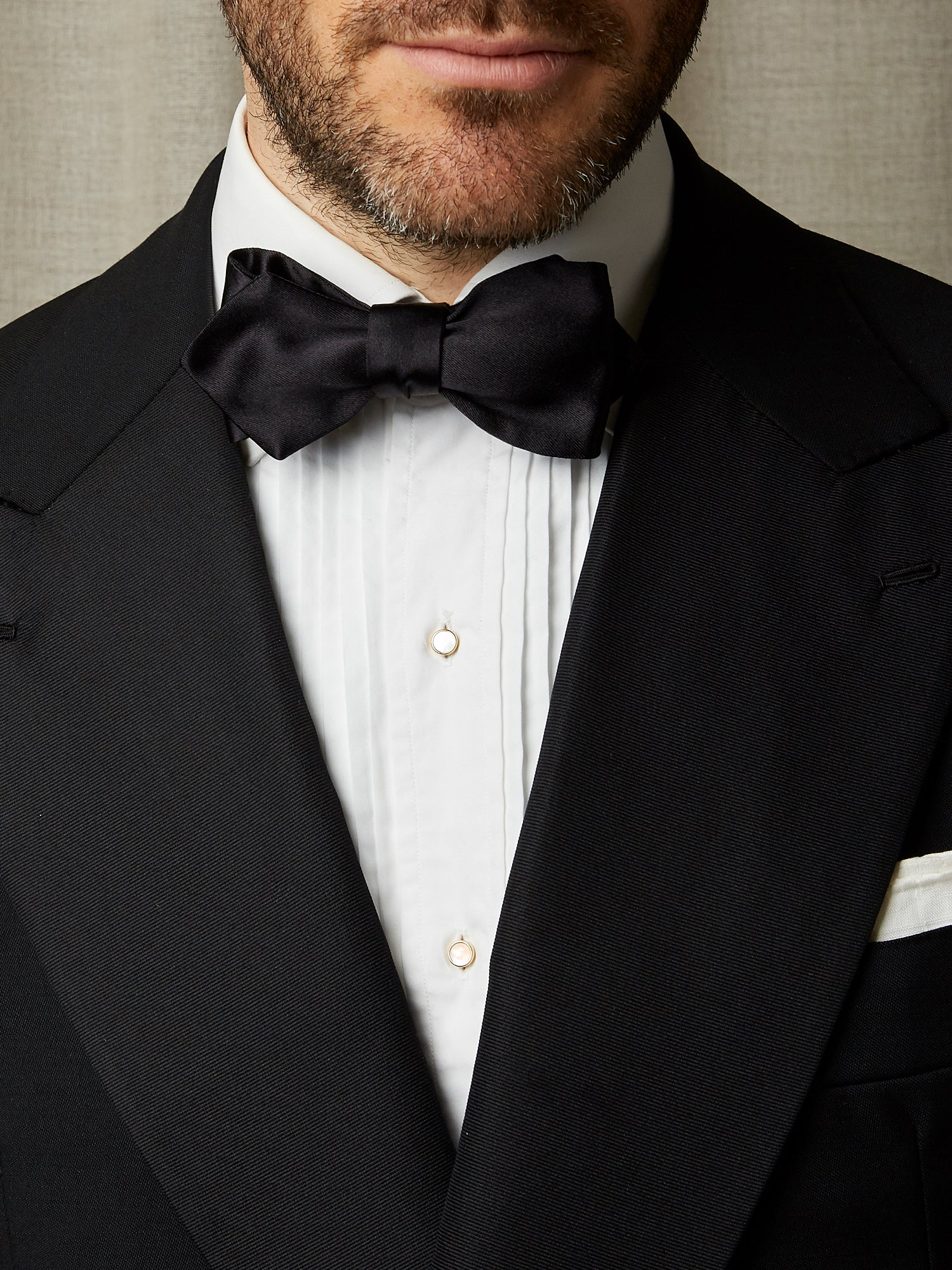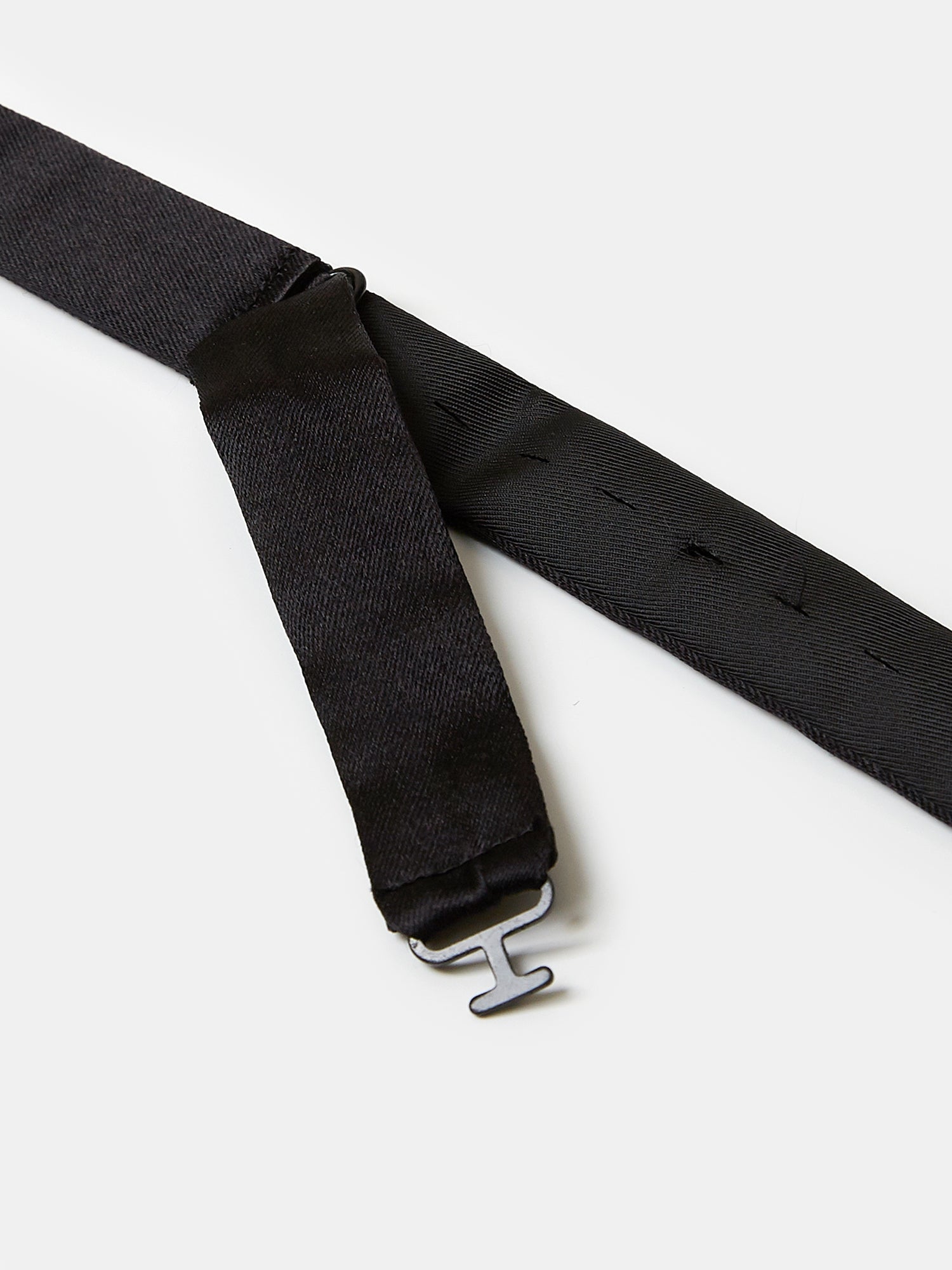 A pointed bow tie in black silk satin, the perfect finishing touch for any black tie event. With pointed ends, this bow creates a subtle but charming touch of asymmetry.