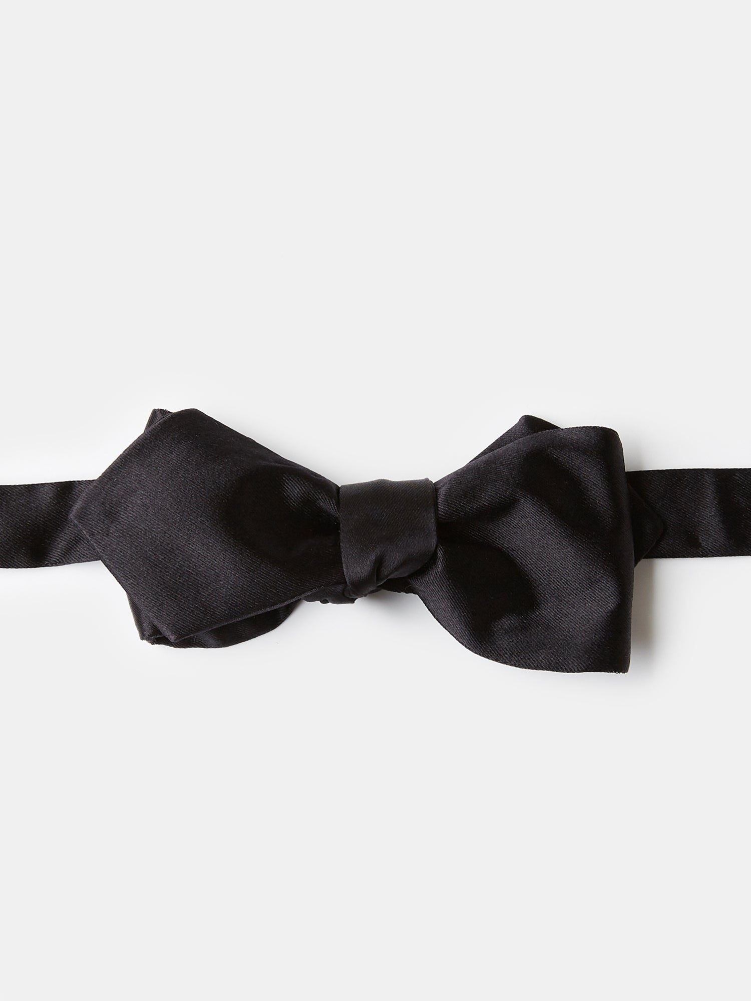 A pointed bow tie in black silk satin, the perfect finishing touch for any black tie event. With pointed ends, this bow creates a subtle but charming touch of asymmetry.