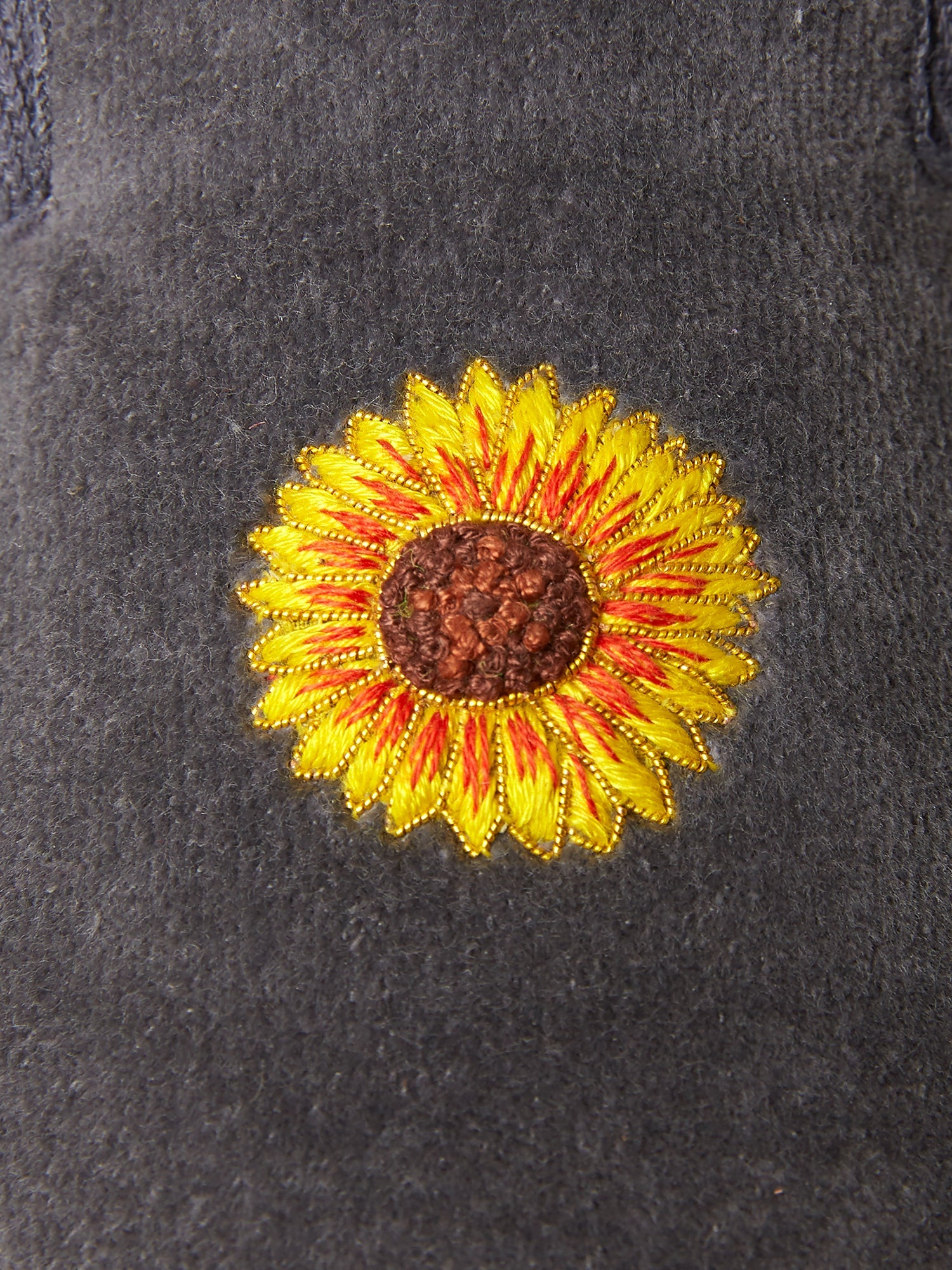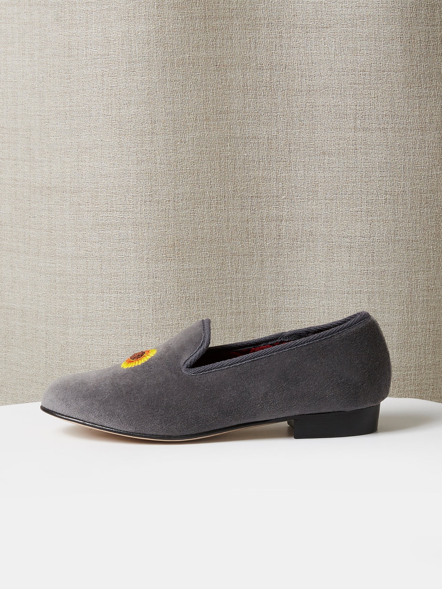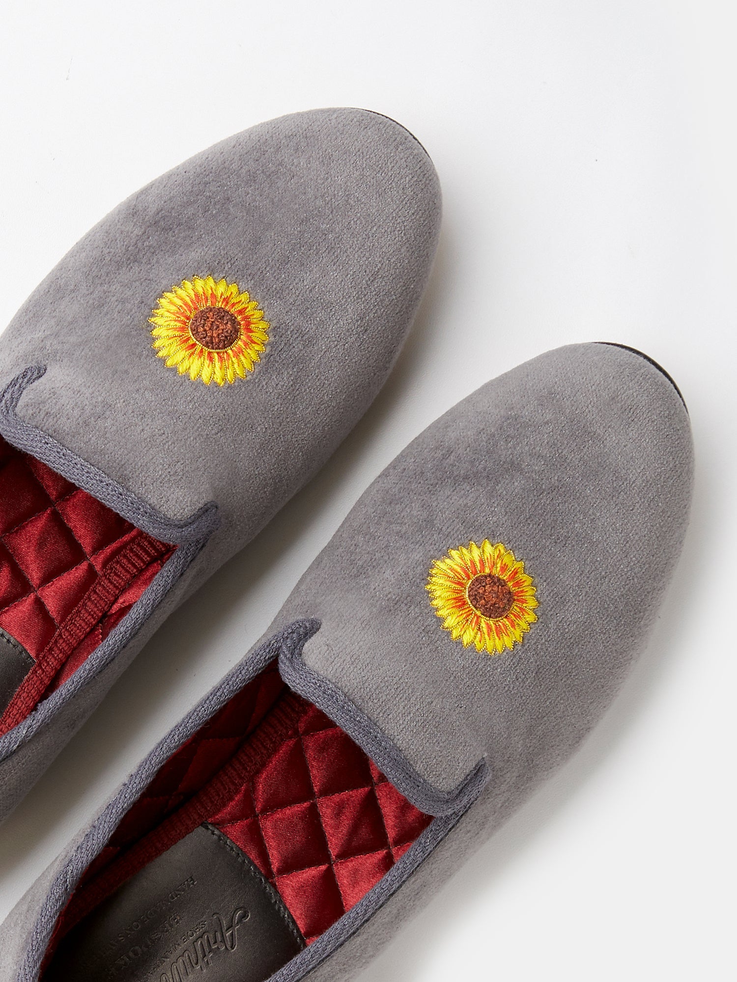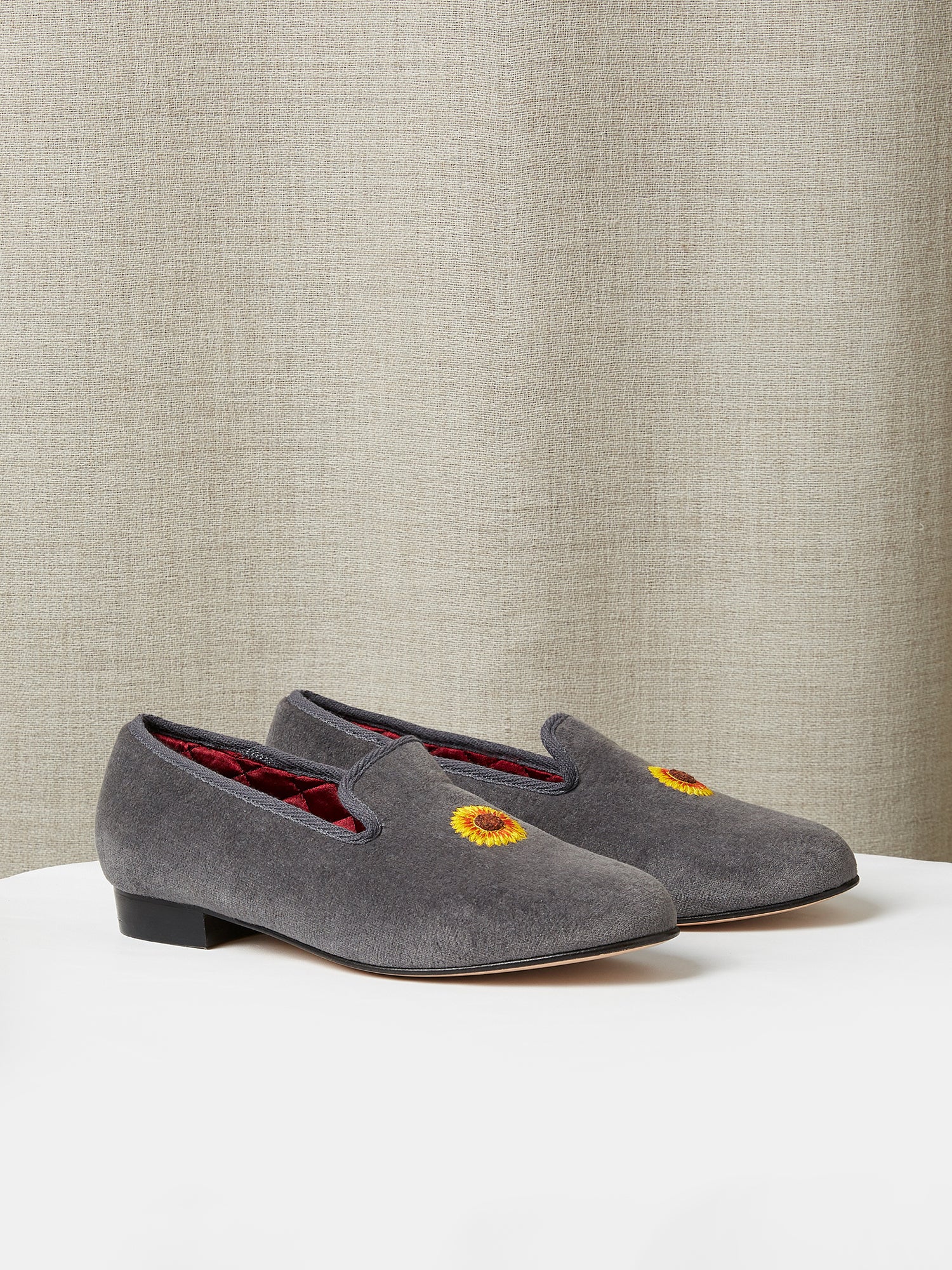 Albert Slipper in Grey Velvet with Hand-Embroidered Sunflower