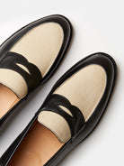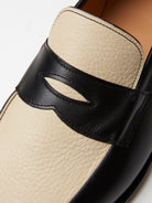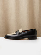 The Spectre is our two-tone goodyear welted penny loafer. Shown here in black French calf leather and cream canvas.