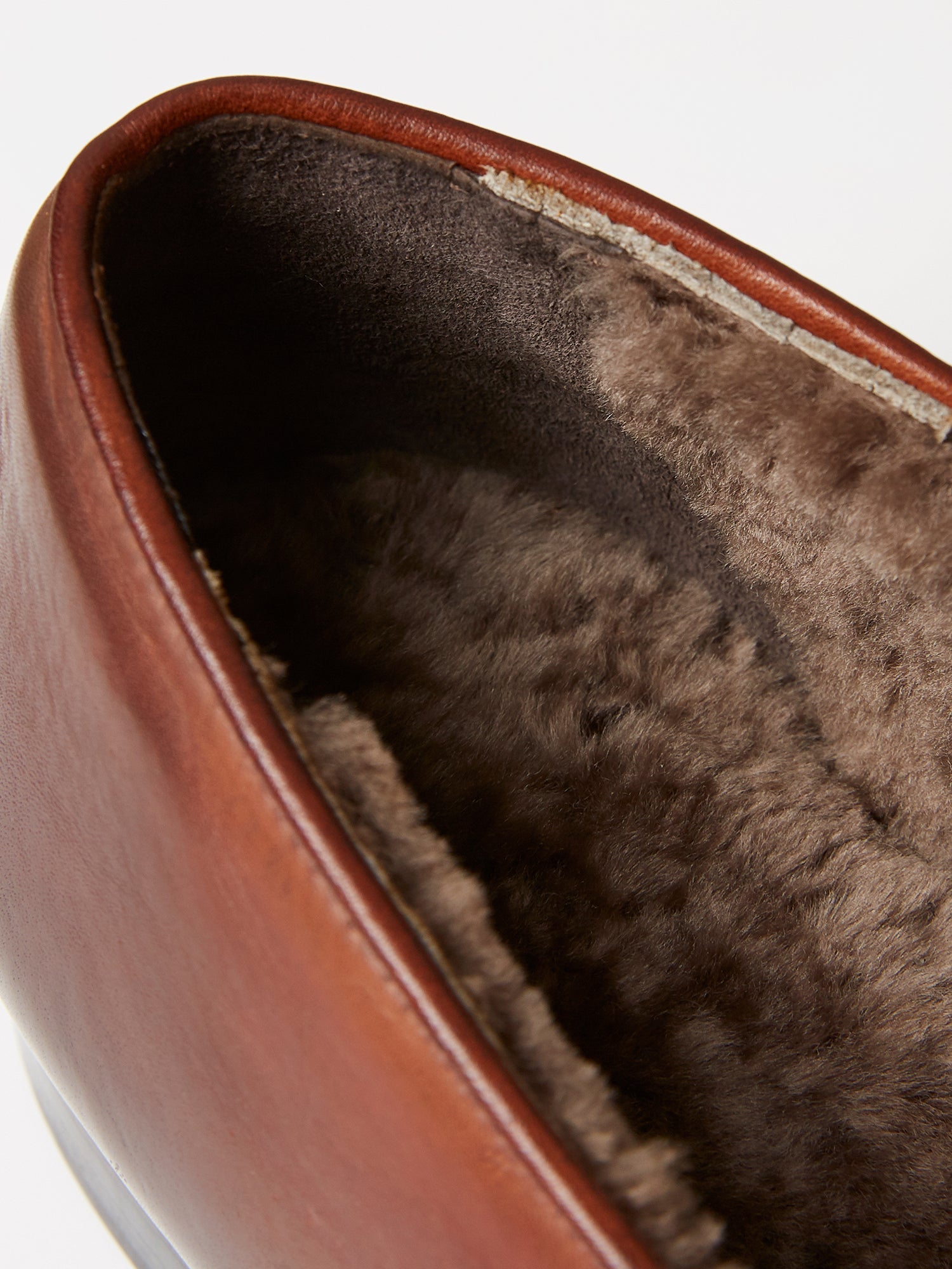 Made with premium french calf leather and a refined Italian leather sole: comfortable, flexible, and battle-tested. With a shearling lining and subject to a multi stage patina process, these shoes are elevated still further.