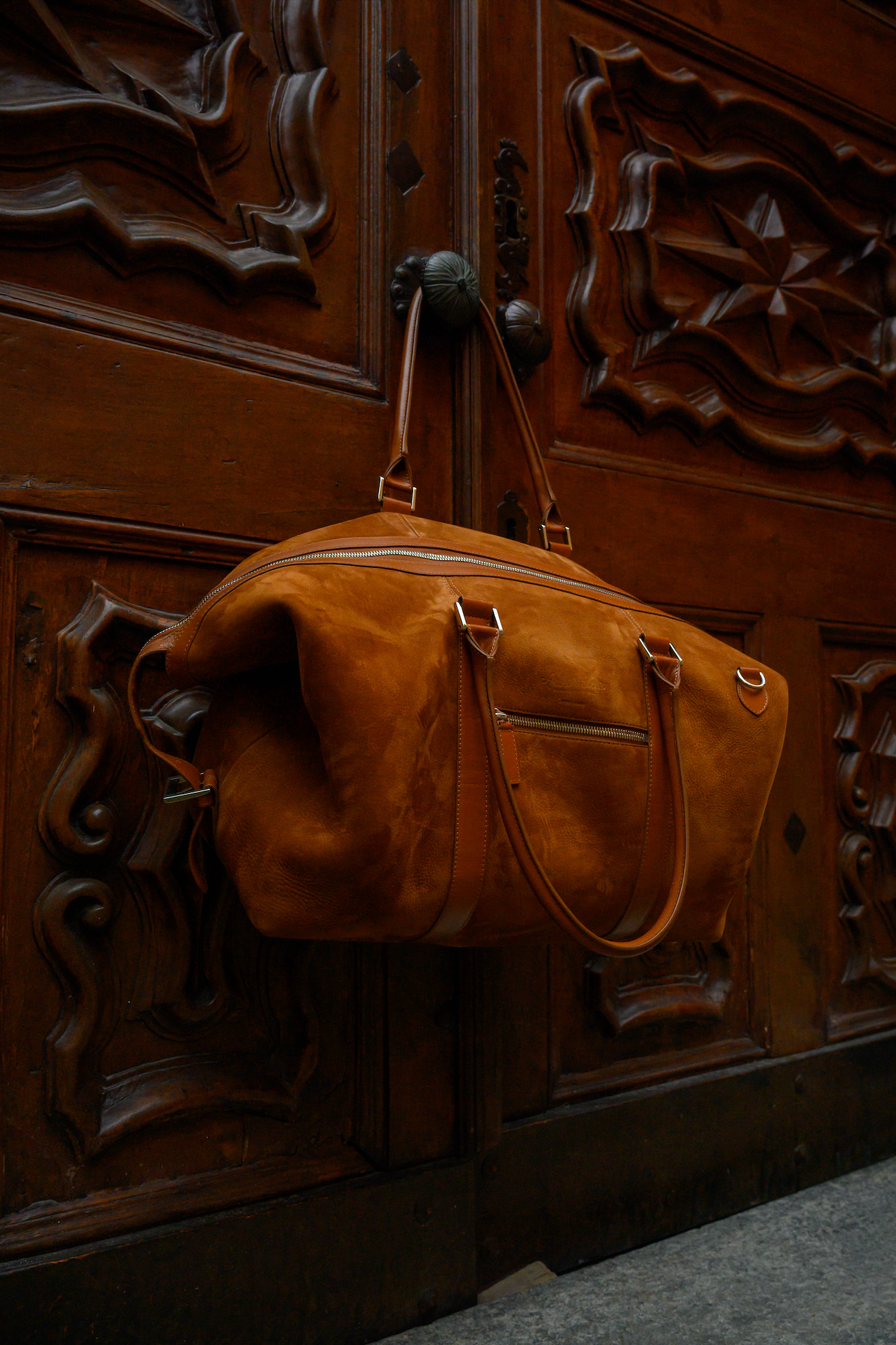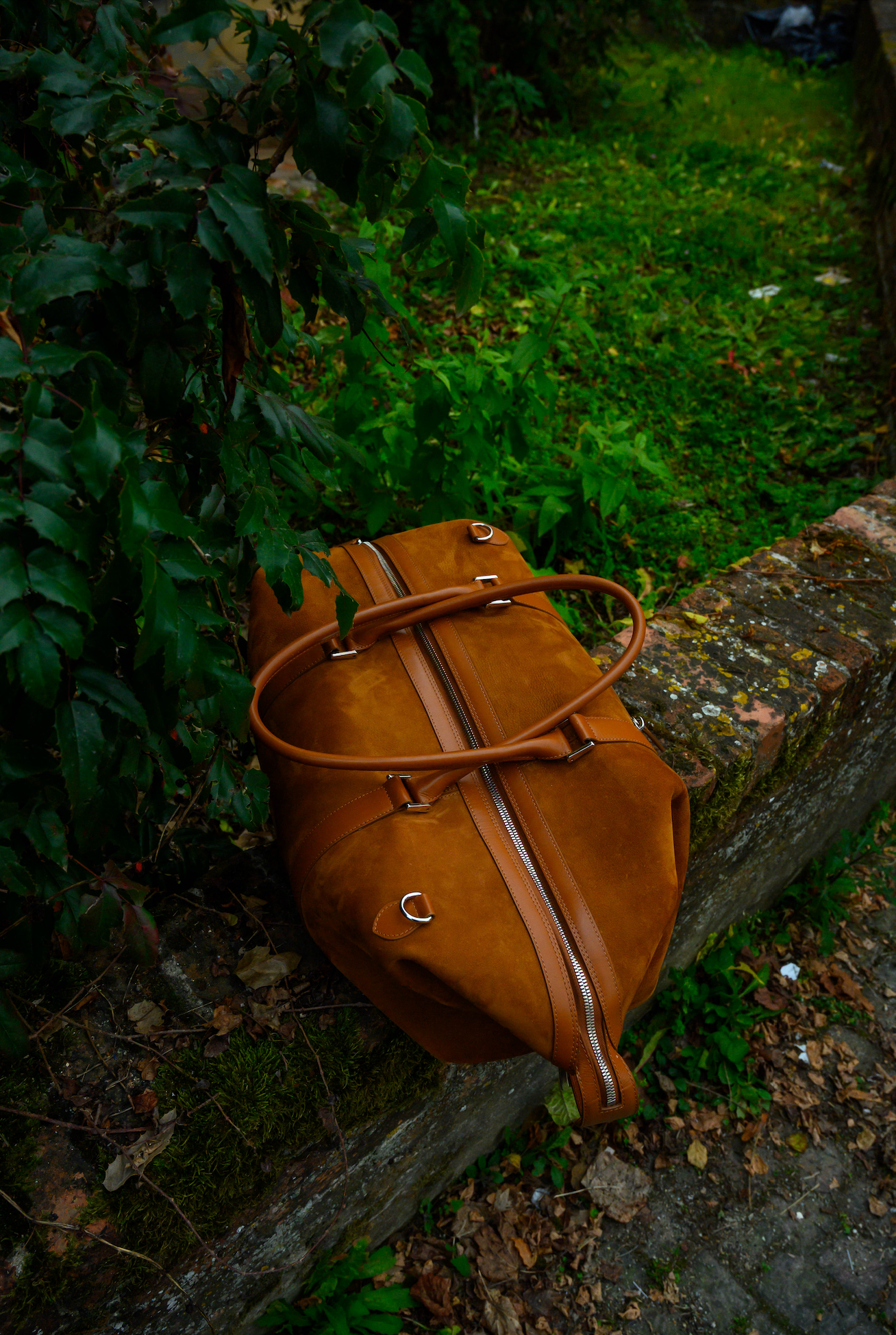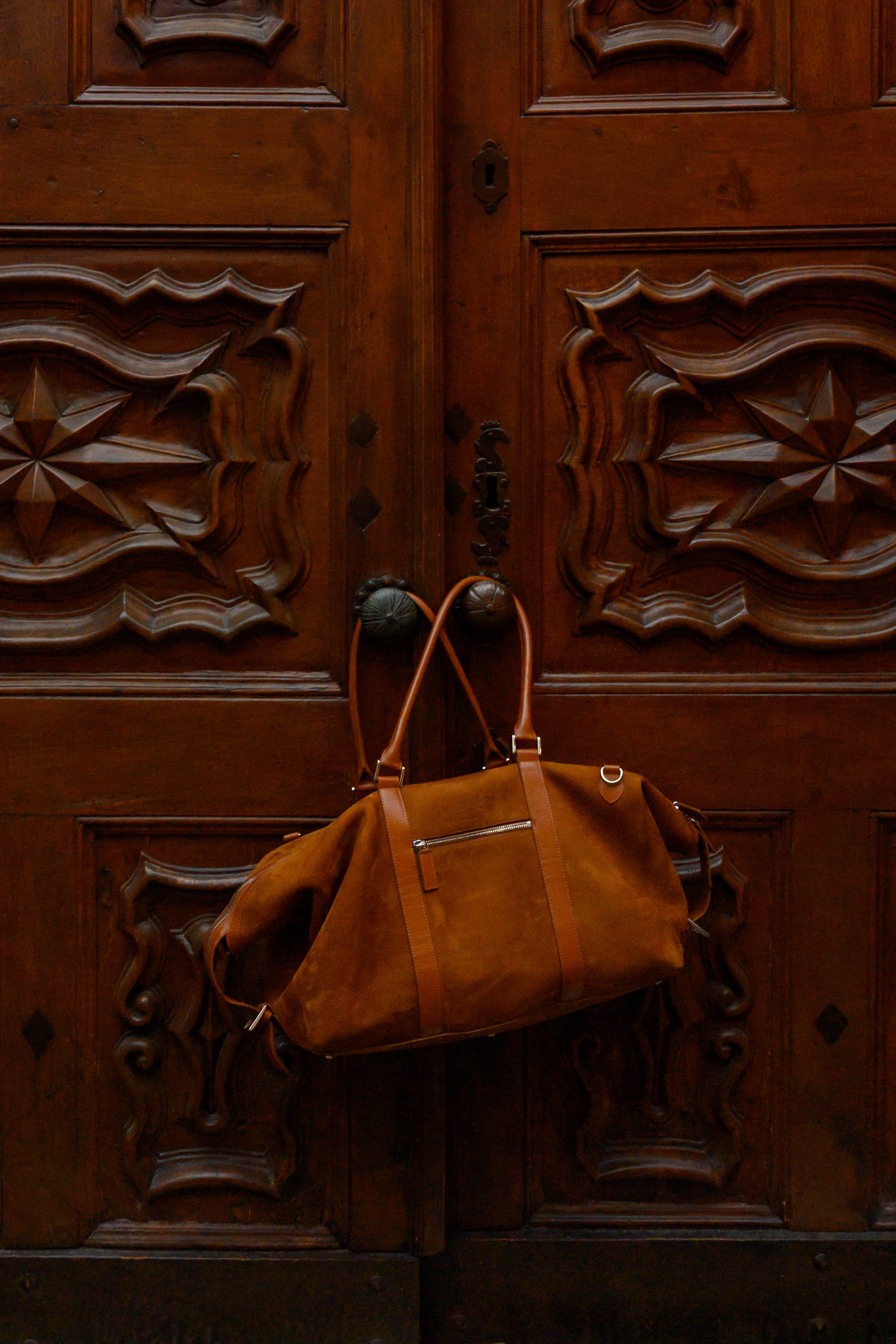 Cut from supple Italian suede in a rich tobacco hue, the Weekender Bag develops its own character with time - softening at the edges, deepening in colour, becoming unmistakably yours. Smooth leather bindings and rolled handles provide structure and strength.